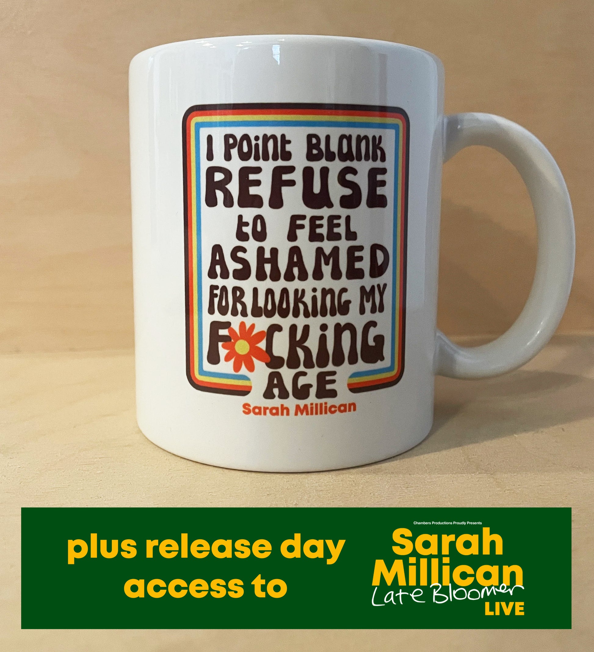 Your order will include the mug and a physical access code to be able to watch Late Bloomer at watch.sarahmillican.co.uk from 15th December 2025.